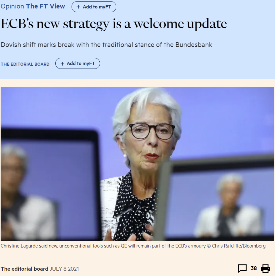 • One FT’s editorial applauded the move by the ECB to review its policy strategy in July 2021